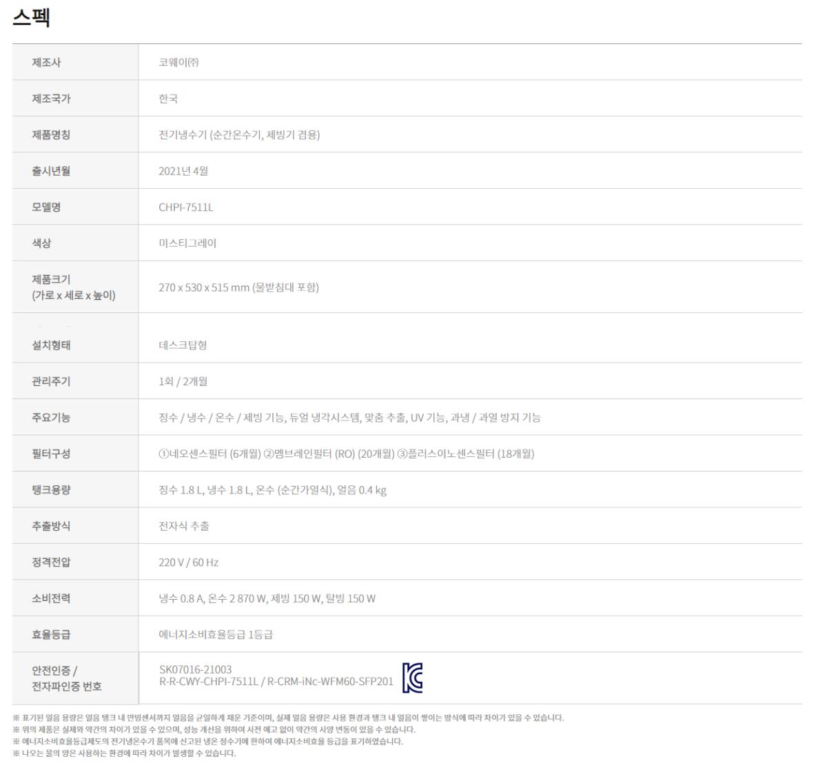 • [코웨이] AIS 정수기 3.0 IoCare 얼음냉온정수기 CHPI-7511L
